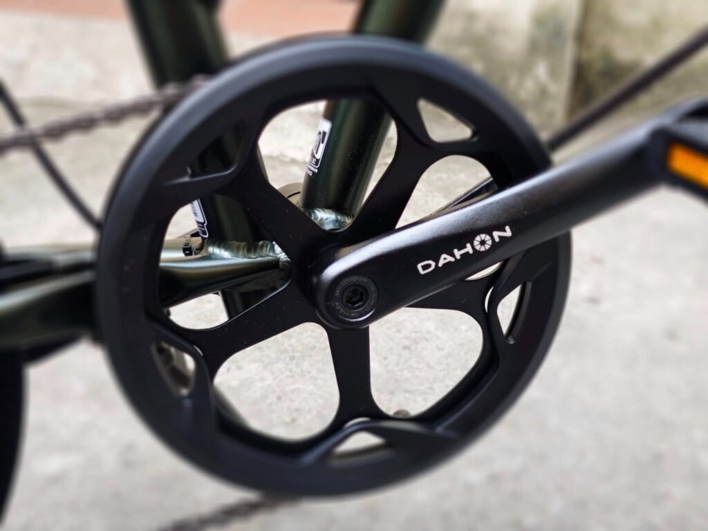 Đùi đĩa của Dahon Yuki KT610 được chế tạo từ hợp kim nhôm bền chắc, đảm bảo truyền lực hiệu quả từ bàn đạp xuống bánh xe. Thiết kế răng đĩa được tính toán tỉ mỉ, giúp tăng hiệu suất đạp và giảm mỏi chân khi di chuyển lâu. Các chi tiết nối và trục quay được gia công chính xác, hạn chế ma sát và tiếng kêu, mang đến trải nghiệm vận hành êm ái.