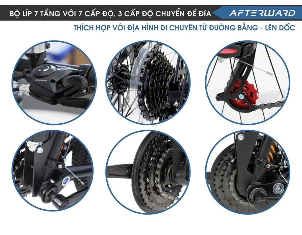 Bộ truyền động trên xe đạp gấp địa hình Afterward được thiết kế nhằm mang lại khả năng vận hành ổn định và linh hoạt. Hệ thống này cho phép người dùng dễ dàng thay đổi cấp số để phù hợp với từng điều kiện đường đi, từ đường bằng trong phố cho đến các đoạn dốc hoặc địa hình phức tạp.
