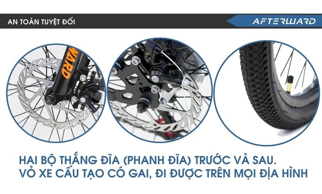 Hệ thống phanh đĩa là trang bị không thể thiếu trên xe đạp gấp địa hình Afterward, đặc biệt khi xe hướng đến việc chinh phục nhiều dạng địa hình khác nhau. Phanh đĩa mang lại lực phanh ổn định, phản hồi nhanh và hiệu quả hơn so với phanh vành truyền thống.
