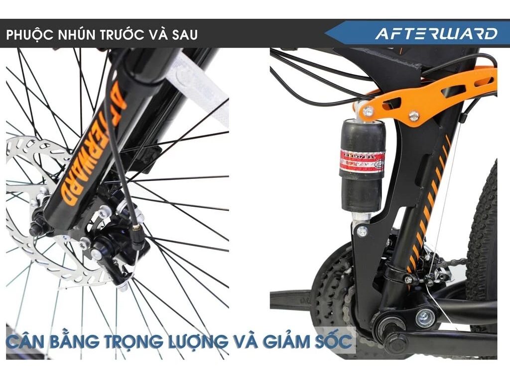 Phuộc là bộ phận quan trọng giúp xe đạp gấp địa hình Afterward thích nghi tốt hơn với nhiều dạng mặt đường khác nhau. Xe được trang bị phuộc trước có khả năng giảm chấn hiệu quả, hỗ trợ hấp thụ xung động khi đi qua ổ gà, đường sỏi hoặc các đoạn gồ ghề.