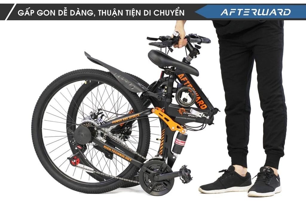 Khả năng gấp gọn chính là điểm cộng lớn giúp xe đạp gấp địa hình Afterward khác biệt so với nhiều dòng xe địa hình truyền thống. Cơ chế gấp được thiết kế khoa học, thao tác đơn giản, giúp người dùng dễ dàng thu gọn xe chỉ trong thời gian ngắn. Khi gấp lại, kích thước tổng thể được rút gọn đáng kể, phù hợp để mang theo trên ô tô, tàu điện hoặc cất trong không gian nhỏ.
