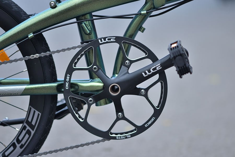 Đùi đĩa trên Ecosmo 10 được lựa chọn theo tiêu chí bền bỉ và ổn định trong sử dụng lâu dài. Thiết kế đùi đĩa giúp lực đạp được truyền đều, hạn chế thất thoát năng lượng khi người dùng tăng tốc hoặc leo dốc nhẹ. Kích thước đĩa trước được tính toán phù hợp với tỉ lệ bánh xe của dòng xe gấp, giúp nhịp đạp không quá nặng cũng không quá nhẹ.