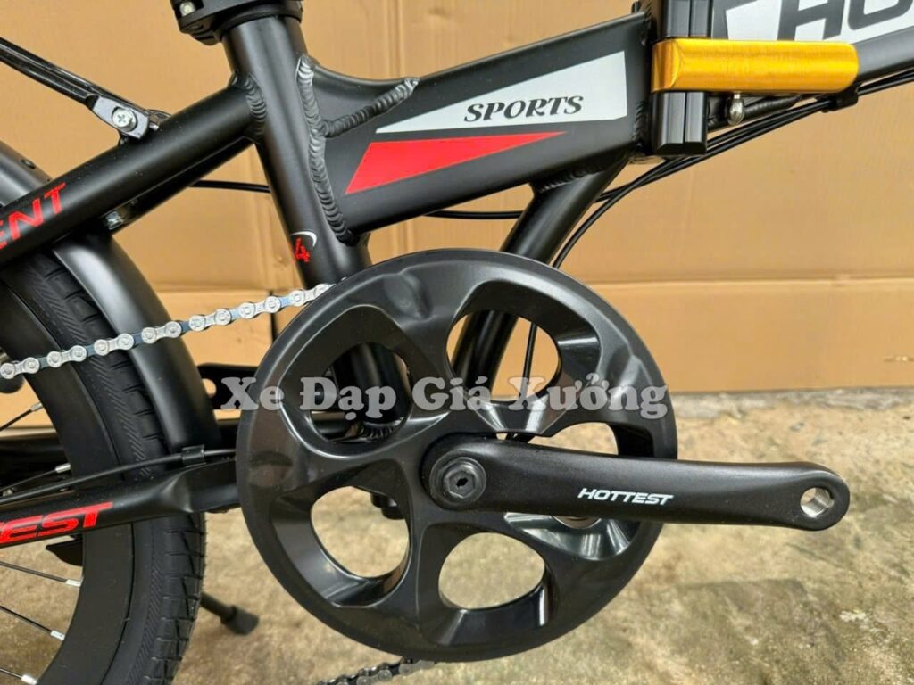 Đùi đĩa là một trong những bộ phận ảnh hưởng trực tiếp đến hiệu suất đạp xe, và trên xe đạp gấp Hottest 20 inch, chi tiết này được hoàn thiện ở mức phù hợp với nhu cầu sử dụng phổ thông. Đùi đĩa có kích thước vừa phải, giúp người lái dễ dàng tạo lực mà không cần dùng quá nhiều sức.