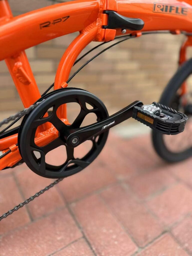 Đùi đĩa trên xe đạp gấp Rifle RP7 được thiết kế theo hướng thực dụng, tập trung vào hiệu quả truyền lực và độ bền. Kết cấu đùi đĩa chắc chắn giúp lực đạp từ chân người dùng được truyền tải ổn định đến bộ truyền động, hạn chế thất thoát năng lượng. Nhờ đó, xe duy trì được nhịp đi đều, không bị hụt lực khi tăng tốc hoặc đạp liên tục trong thời gian dài.