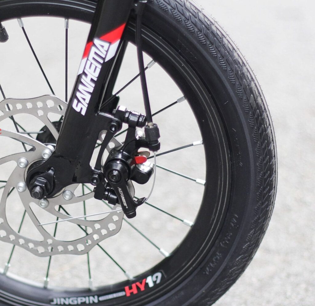 Xe đạp gấp Sanhema 16inch được trang bị hệ thống phanh đĩa, mang lại khả năng kiểm soát tốc độ ổn định và an toàn hơn so với các loại phanh truyền thống. Phanh đĩa giúp lực phanh phân bổ đều, giảm quãng đường phanh khi cần dừng xe đột ngột. Điều này đặc biệt quan trọng khi di chuyển trong môi trường đô thị đông đúc, nhiều tình huống bất ngờ.