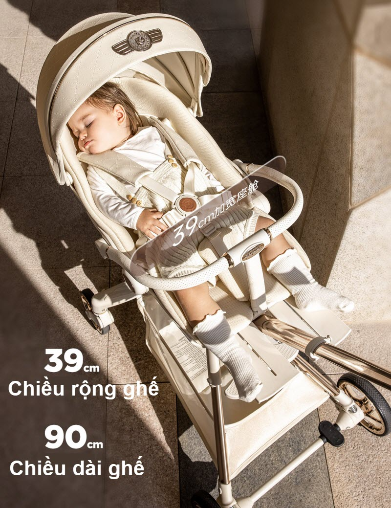 Ghế thiết kế sâu và thành cao, giúp ôm trọn bé, đảm bảo an toàn tuyệt đối khi di chuyển. Bé có thể tự do xoay người, duỗi chân mà không bị gò bó hay khó chịu. Khoang ghế đủ rộng để bé dùng thoải mái từ sơ sinh đến 6 tuổi mà không cần đổi xe.