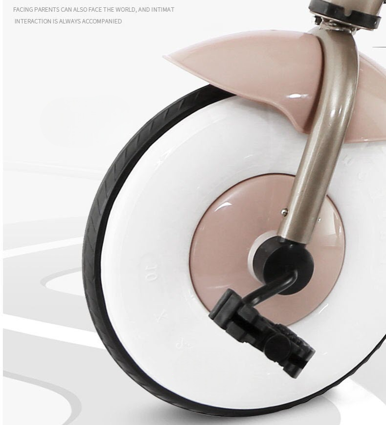 Xe đẩy 838A sở hữu hệ thống 3 bánh lớn được làm từ nhựa EVA cao cấp, tăng độ bám đường và giảm chấn tối ưu. Nhờ bánh đôi phía sau và bánh to phía trước có khả năng xoay linh hoạt, xe vận hành ổn định ngay cả khi đẩy trên vỉa hè, bãi cỏ hay đường gồ ghề. Chất liệu bánh chống trơn trượt giúp bé an toàn khi tự đạp xe hoặc được người lớn đẩy.
